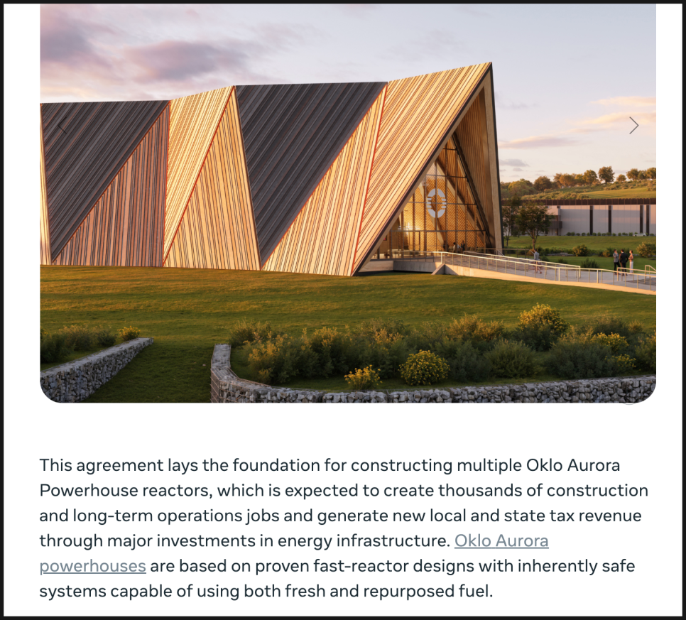 프로젝트 부지는 과거 미국 에너지부가 소유했던 206에이커 규모의 토지이고, 오클로는 이곳에 여러 기의 오로라 파워하우스 소형 원자로를 배치할 계획입니다. 메타는 단순히 전력을 구매하는 데 그치지 않고, 전력 선구매와 직접 자금 지원 방식을 통해 프로젝트의 불확실성을 줄여주겠다는 입장입니다. 이른바 프로젝트 확실성을 제공하겠다는 건데, 초기 원자력 프로젝트에서 가장 부족한 부분을 메워주는 역할이라고 보시면 됩니다.
