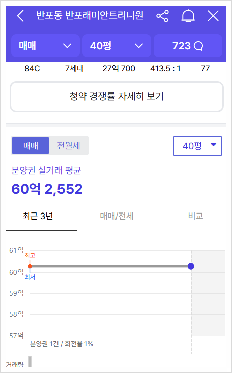 그때는, 디에이치 방배보다 2억원 가량 비싸 좀 높은 분양가라고 생각했지만, 25년 말에 분양한 분당 티에르원이 분양가가 26억, 이수역 힐스테이트 센트럴이 22억을 한 것을 보면 확실히 선녀라고 알 수 있다. 게다가 서울 핵심지에는 거의 모든 단지 내 임대주택 단지가 있지만 임대주택이 없고 당시에는 실거주 의무를 받지 않았다. 그 결과 경쟁률이 무려 151대1이었고 당첨가점이 69점이란 엄청난 인기를 보여주었다.
