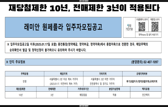 방배동 래미안 원페를라는 25년 1월에 분양했기에, 당시에는 투기과열지구가 강남, 서초, 송파, 용산 4군데 밖에 되지 않아 대출규제만 받았었다. 실거주의무는 당시에는 없었지만, 10.15대책 이후 어떻게 변할 지는 미지수이다. 래미안 원페를라 역시 거주지 우선으로 서울시 2년 이상 거주자에게 우선권이 주어질 것이고 다음으로 서울 2년 미만 거주자, 인천 및 경기도 거주자에게 청약 자격이 주어진다.