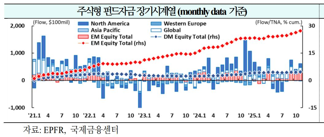 37주 연속 유입(+$225억 → +$5억 → +$142억): `26년 미국 경제는 견조한 흐름이 예상. 무역 정책 불확실성은 완화되는 가운데, 감세에 따른 가계소득 증가 등은 성장세 회복 및 노동시장 안정을 뒷받침할 전망. 관세율 인하에 따른 디스인플레이션 압력 강화와 미 연준의 통화정책 기조의 비둘기파적 성향이 강화되며 기준금리는 연말까지 3.5% 이하로 인하될 것으로 예상(DB)