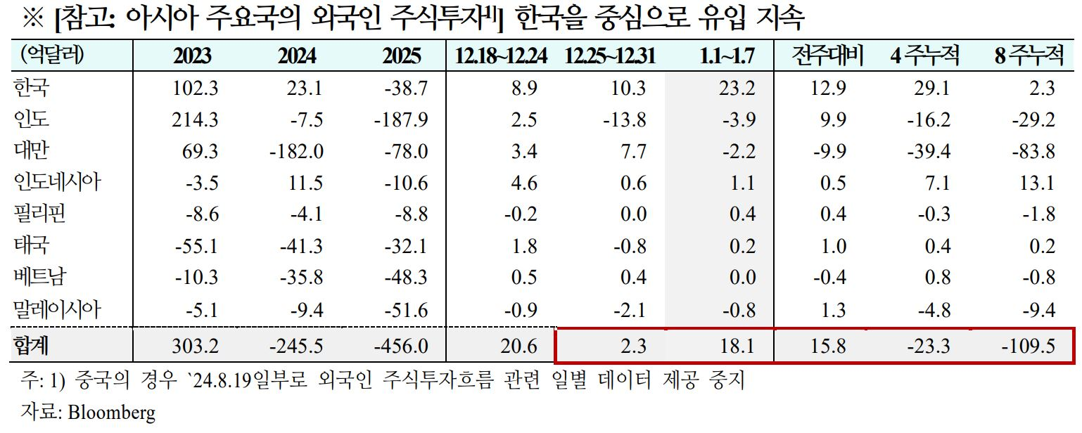 이에 ‘주간 글로벌 투자 자금 흐름(26년 1월 1일 ~ 1월 7일)’ 관련하여 국제금융센터 보고서를 통해 좀 더 자세히 알아보도록 하겠습니다.
