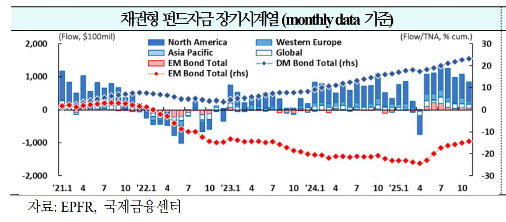 12주만에 유출 전환(+$120억 →+$53억 →-$60억):`26년 미국 경기 반등 시, 신흥국 통화에 하방 압력이 있을 수 있어 향후 미국 경제지표가 신흥국 경제상황에 주요 변수로 작용할 전망. 금리 경로는 인플레이션과 재정 여건 등 국가별 펀더멘탈에 따라 차별화되겠으나, 전반적으로는 당분간 정책금리 동결과 박스권 거래가 예상(Barclays)