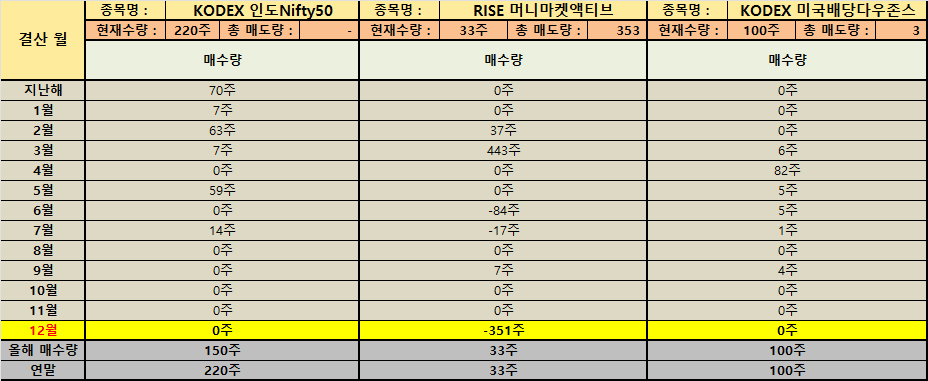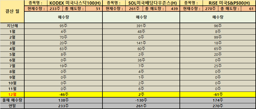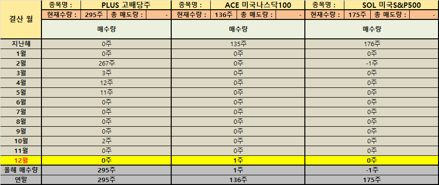 퇴사 이후에는 현금 흐름의 확실성이 낮아지기 때문에 포트폴리오를 ‘유연하게’ 만드는 일이 중요해집니다. 이번 자료에서도 그런 움직임이 수치로 드러납니다. 연금저축과 ISA에서 국내 상장 ETF의 보유 수량을 보면 PLUS 고배당주 295주 보유처럼 장기 운용의 뼈대를 유지한 종목이 있는 반면 SOL미국배당다우존스(H) 연간 매수량 -130주처럼 한 해 동안 일부를 정리하며 비중을 낮춘 흔적도 확인됩니다. 이 조합은 방향성이 한쪽으로 쏠렸다기보다 상황에 맞춰 기민하게 중심을 조절한 결과로 해석할 수 있습니다.