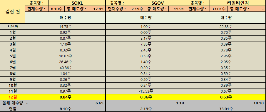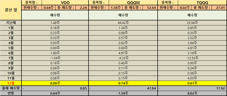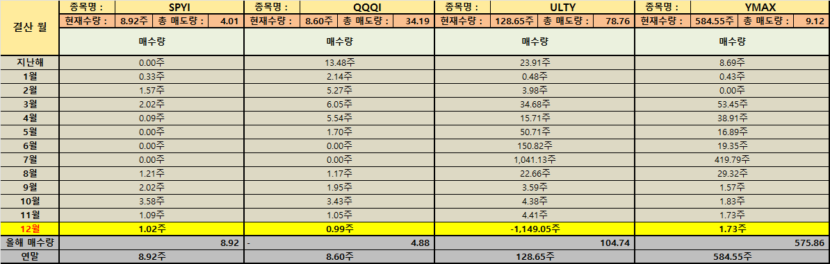 미국 직투 계좌에서도 비슷한 흐름이 보입니다. VOO는 연간 매수량이 -0.85주로 기록되어 있고 보유는 0.64주로 남아 있습니다. QQQM 역시 연간 매수량 -47.84주로 표기되어 있고 보유는 1.58주입니다. 한 해 동안 성장 지수 비중을 줄이며 변동성을 낮추려 했던 선택으로 연결됩니다. 반대로 ULTY 104.74주 매수 후 128.65주 보유 YMAX 575.86주 매수 후 584.55주 보유처럼 현금 흐름을 강하게 만드는 쪽으로도 움직임이 있었는데 이는 ‘불확실한 시기에는 현금 흐름이 심리적 안전벨트가 된다’는 경험적 판단이 반영된 결과로 이해됩니다.