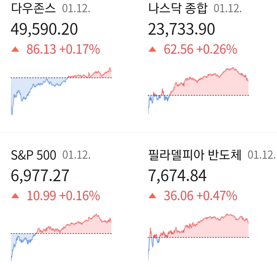 다우지수는 전일 대비 +0.17% 오른 49,590.20에 거래를 마쳤으며, 대형주 중심의 S&P500 지수는 전장 대비 +0.16% 상승한 6,977.27에 장을 마감하였습니다. 기술주 중심의 나스닥 지수는 전 거래일 대비 +0.26% 상승한 23,733.90에 거래를 마치며 장을 마감하였습니다.