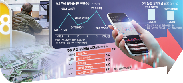 13일 금융계에 따르면 KB국민·신한·하나·우리·NH농협은행 등 5대 은행의 전날 현재 요구불예금 잔액은 646조 5254억 원으로 지난해 말(674조 84억 원)과 비교해 27조 4830억 원 감소