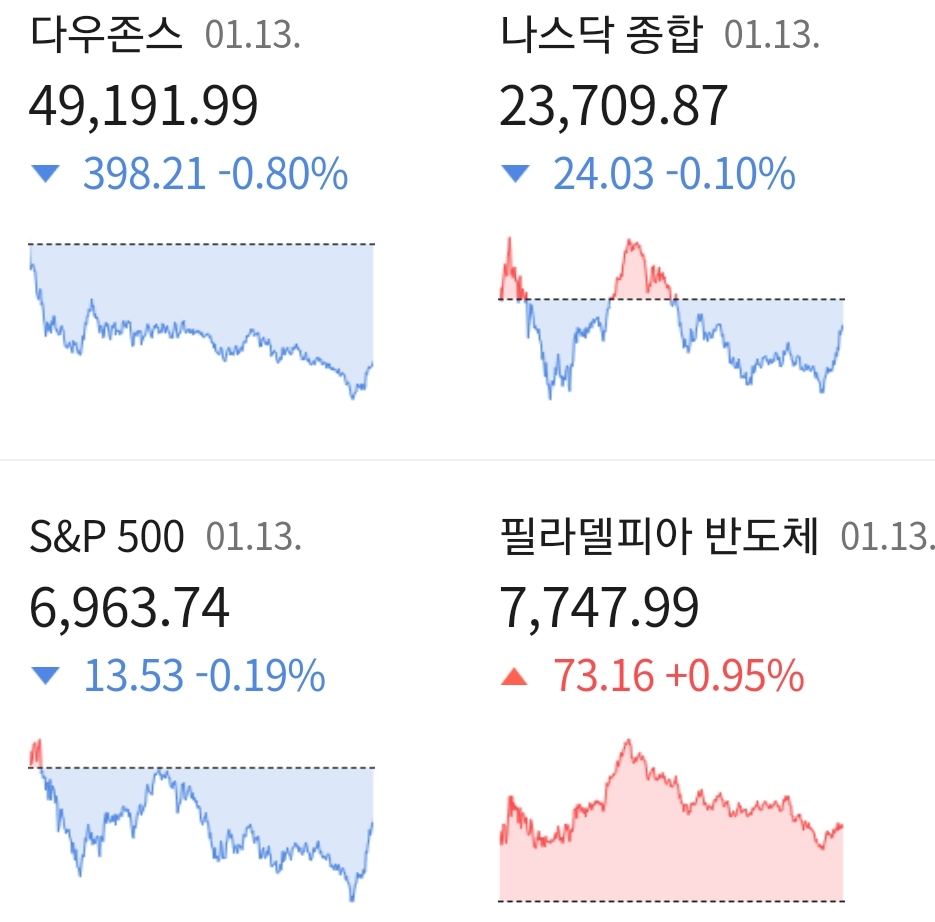 다우지수는 전일 대비 -0.80% 떨어진 49.191.99에 거래를 마쳤으며, 대형주 중심이 S&P500 지수는 전장 대비 -0.19% 하락한 6,963.74에 장을 마감하였습니다. 기술주 중심의 나스닥 지수는 전 거래일 대비 -0.10% 떨어진 23,709.87에 거래를 마치며 장을 마감하였습니다.