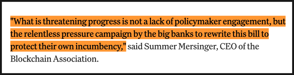 블록체인 협회 최고경영자인 서머 머싱거는 문제의 본질이 정책 논의의 부족이 아니라, 대형 은행들이 기존 기득권을 지키기 위해 법안을 다시 쓰게 만들려는 압박이라고 공개적으로 비판했습니다.