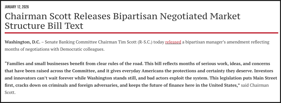 이번 결정은 상원이 최근 수정된 클래리티 법안 초안을 공개한 직후에 나왔습니다. 팀 스콧 상원의원이 공개한 이 개정안에는 민주당 의원들과 수개월간 협상한 내용이 반영돼 있다고 알려졌습니다. 이번 문서는 278페이지 분량으로, 그동안 업계와 정치권이 오래 끌어오던 쟁점들 가운데 일부에 대해 사실상 결론을 담고 있습니다. 법안 전문은 1월 21일, 마크업에 앞서 공개될 예정입니다.