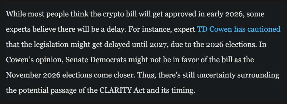 시장에서는 대체로 2026년 초에 법안이 통과될 것이라는 기대가 많지만, 반대 의견도 있습니다. 투자은행 티디 코웬 쪽에서는 이 법안이 2027년까지 미뤄질 수 있다고 경고했습니다. 2026년 중간선거가 가까워질수록 상원 민주당이 이 법안에 소극적인 태도를 보일 가능성이 있다는 이유입니다.