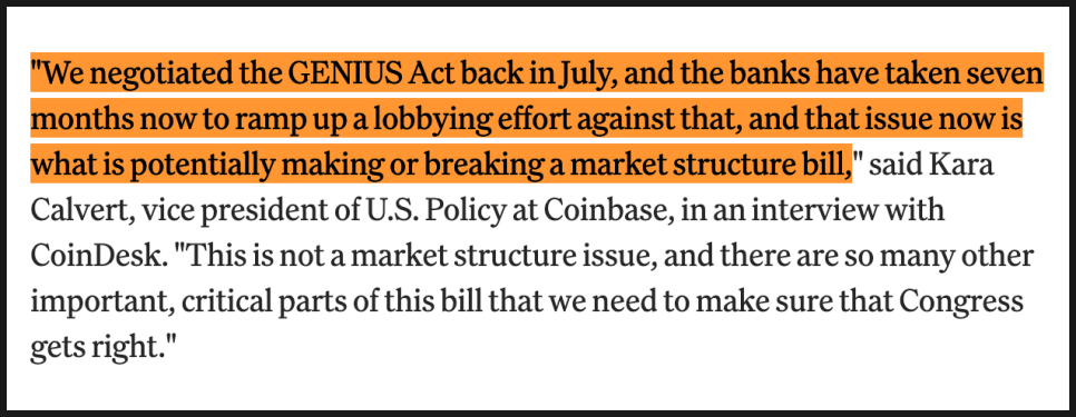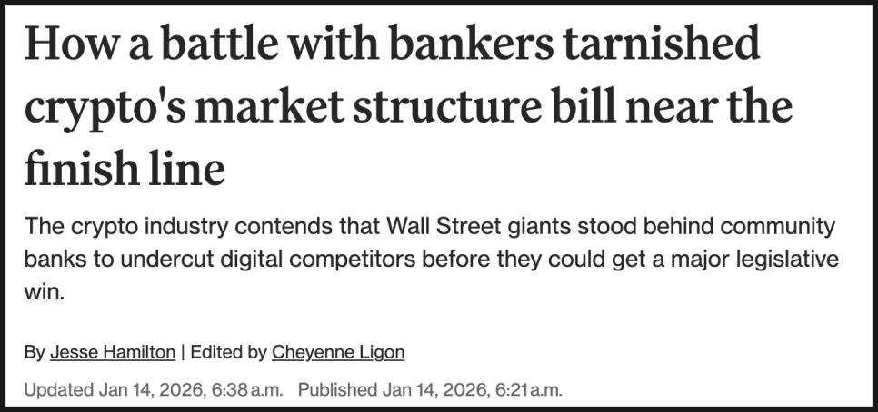 한편 암호화폐 업계가 가장 크게 느낀 변수는 정당 간 갈등이 아니라 막판 협상 테이블에 본격적으로 등장한 은행 로비스트들이었다는 보도도 있습니다. 법안이 거의 완성 단계에 들어섰다고 믿고 있던 상황에서, 은행권이 강하게 개입하면서 판이 흔들렸다는 게 업계의 시각입니다.