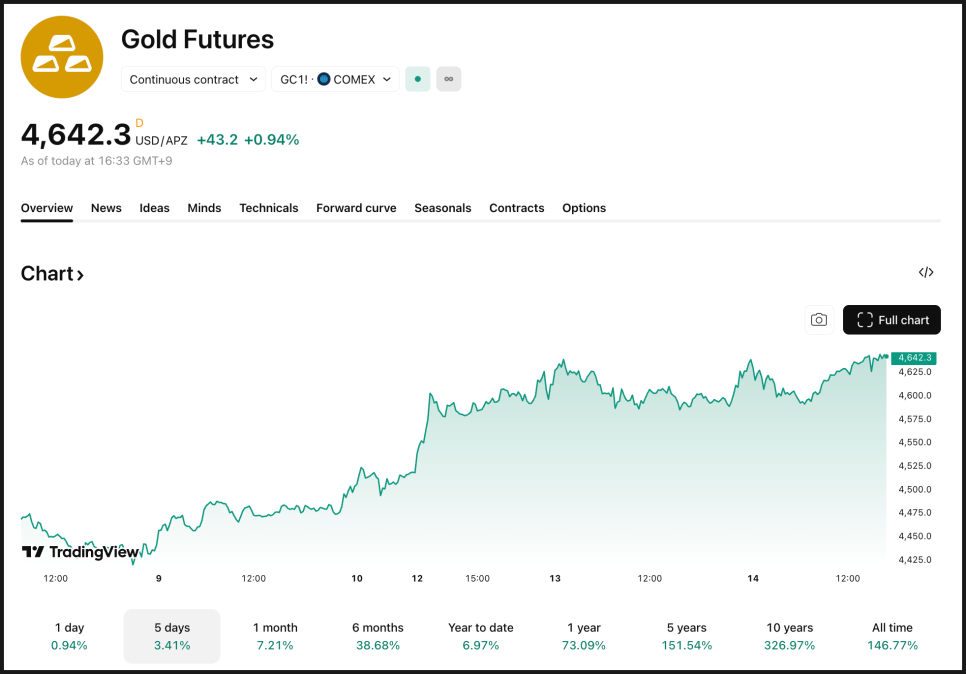 반면 금 가격은 4,600달러를 돌파하며 계속 강세를 보이고 있죠. 위험자산 중에서도 자금이 주식에서 빠져나와 금과 암호화폐 쪽으로 일부 이동하는 흐름이 엿보입니다.
