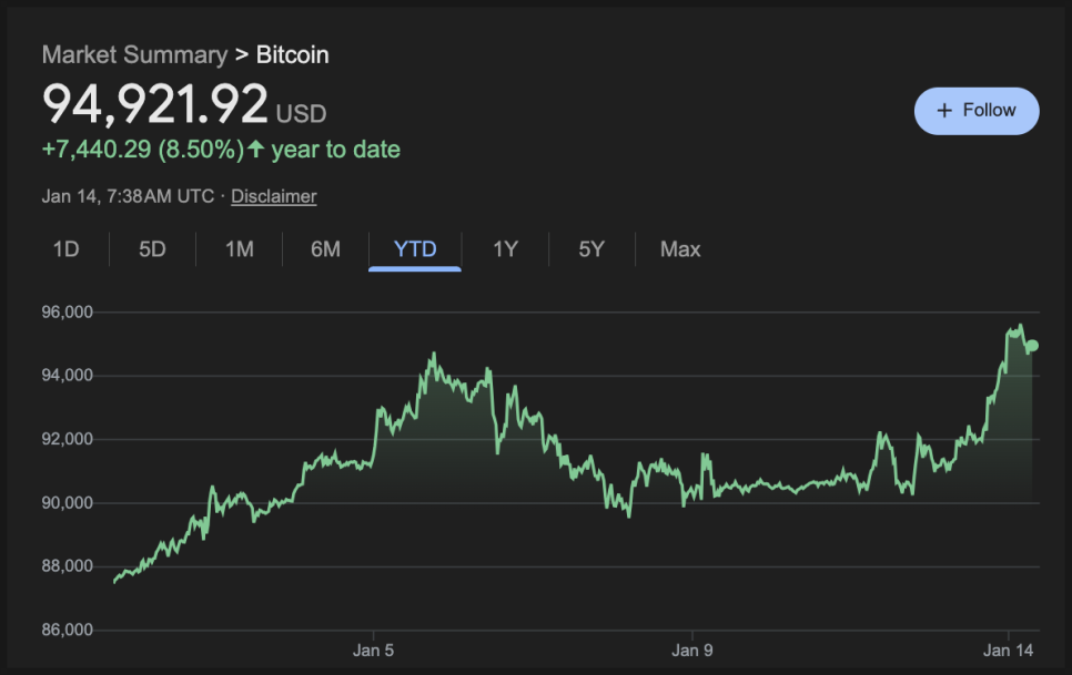 비트코인이 1월 14일 기준으로 한때 9만5천 달러까지 넘기며 상승했습니다. 주말 동안 9만1천 달러 부근에서 지지를 받은 뒤 반등했고, CPI 발표 이후 상승 폭을 키우며 9만5천 달러 선까지 올라왔습니다. 다만 이 구간은 지난 거의 두 달 동안 가격이 번번이 막혔던 강한 저항대인데요. 대략 9만3천5백 달러에서 9만5천 달러 사이가 현재 가장 중요한 분기점이라고 볼 수 있죠.
