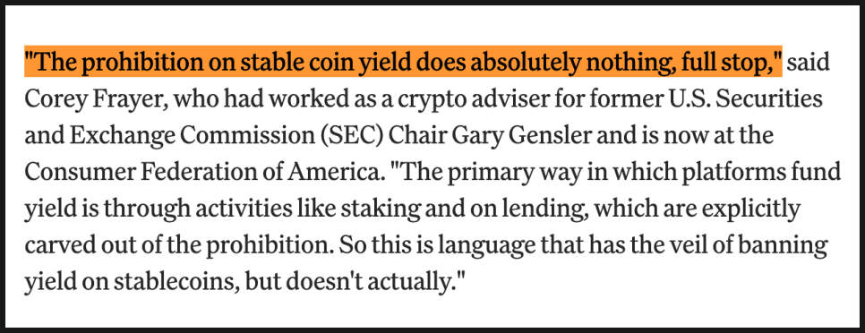 이번 상원 은행위원회 초안에서 드러난 변화는 은행 로비가 어느 정도 성과를 냈다는 신호로 읽힙니다. 앞서 언급했듯이 법안에는 “스테이블코인을 그냥 들고 있기만 해도 예금처럼 이자가 붙는 구조”는 금지한다는 내용이 들어갔습니다. 다만 거래나 활동에 따른 보상은 여전히 허용됐습니다. 겉으로 보면 절충안이지만, 암호화폐 업계 입장에서는 후퇴로 느껴질 수밖에 없는 대목입니다.