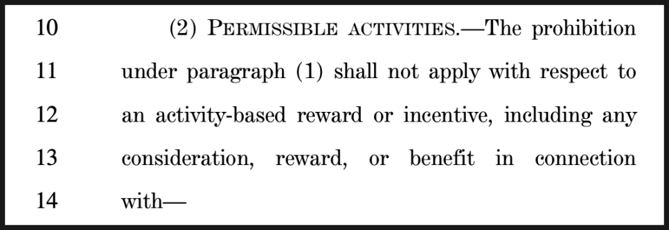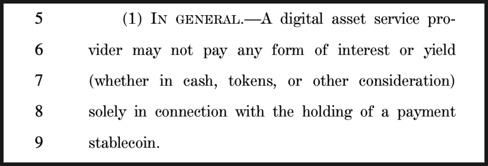 이번 법안은 디지털 자산 서비스 제공자라는 개념을 쓰고 있는데, 여기에는 거래소, 수탁 업체, 발행사 등이 포함됩니다. 즉, 스테이블코인 보상 규제의 적용 대상이 비교적 넓다는 뜻이죠.