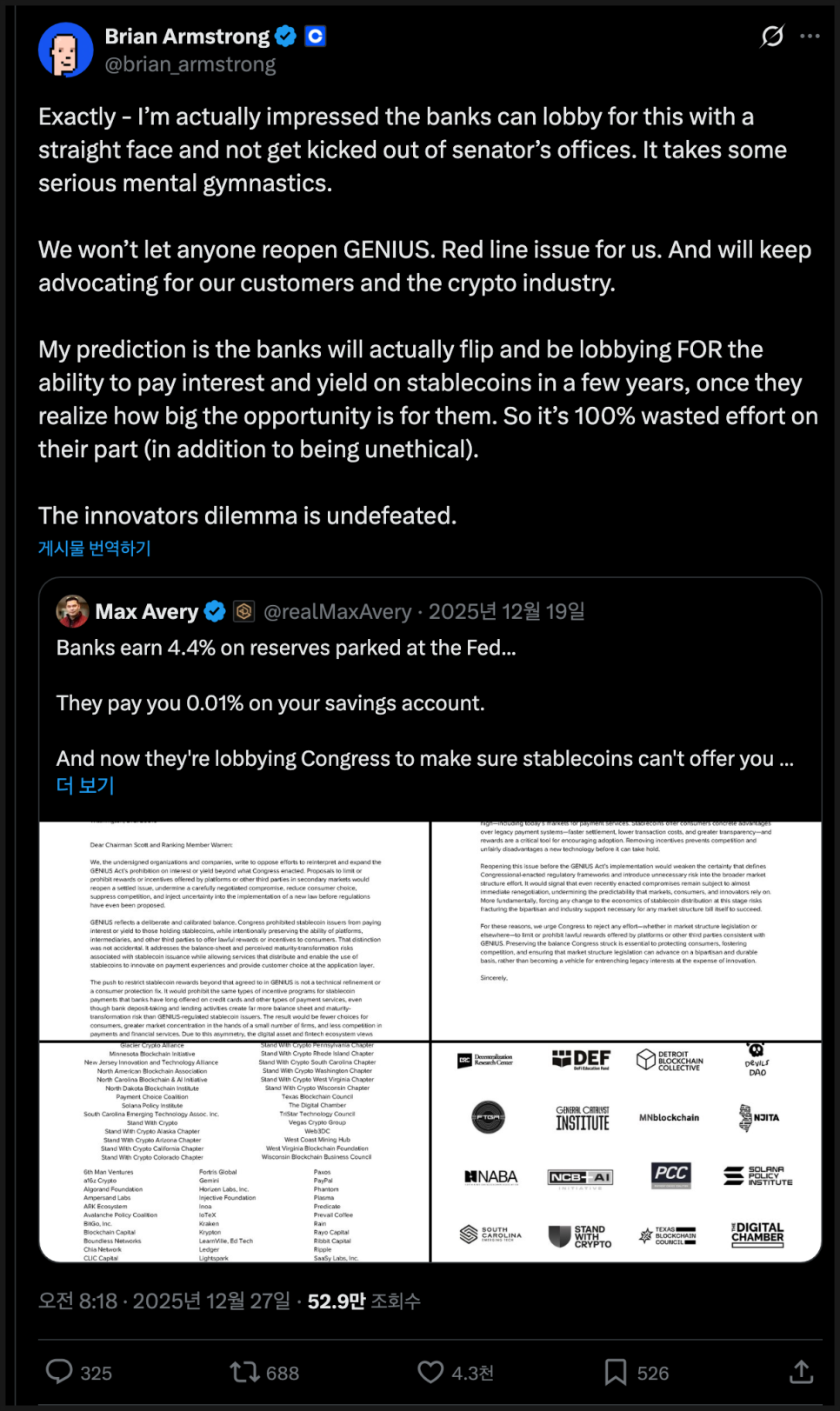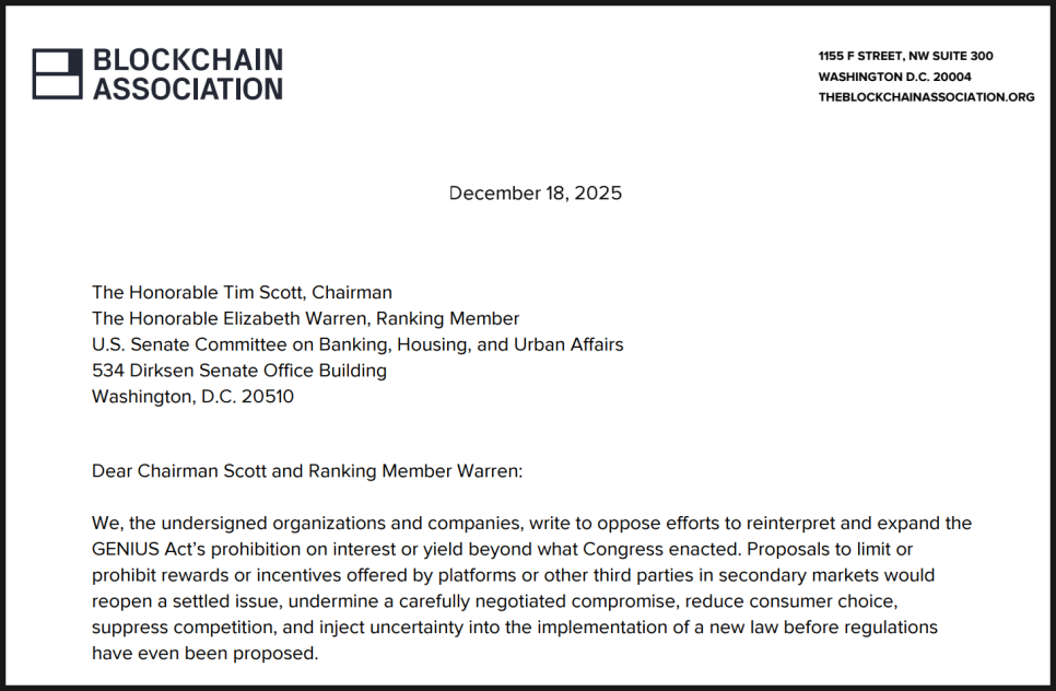 암호화폐 업계는 지난해 12월, 주요 상원의원들에게 공동 서한을 보내 지니어스 법에서 이미 합의된 사안을 다시 뒤집는 것은 소비자 선택권을 줄이고 경쟁을 억제하며, 이제 막 시행 단계에 들어간 법에 불확실성을 더하는 일이라고 주장했습니다. 당시에도 “플랫폼과 제3자가 합법적으로 보상을 제공할 수 있도록 한 건 우연이 아니라 의도된 설계”라고 강조했죠.