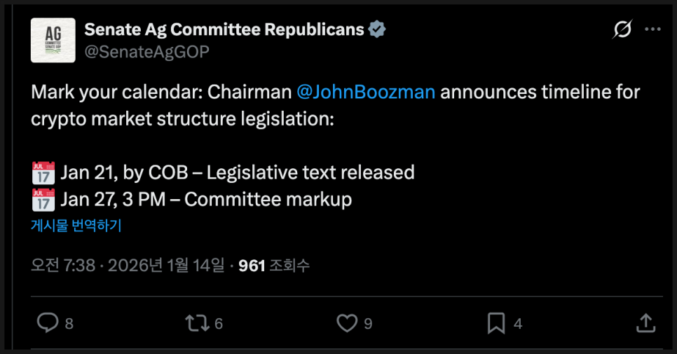 한편 요즘 코인 투자자들이 신경 쓰고 있는 클래리티 법안이 미국 상원에서 중요한 국면에 들어섰다는 소식이 나왔습니다. 상원 농업·영양·산림위원회가 이 법안의 마크업, 그러니까 조문을 하나씩 검토하고 수정하는 공식 심의 일정을 2026년 1월 27일로 확정했기 때문입니다. 위원장인 존 부즈먼 상원의원은 이 일정이 투명성을 확보하고 충분한 검토 시간을 보장하기 위한 결정이라고 설명했습니다. 소비자 보호와 미국의 혁신을 동시에 지킬 수 있는 새로운 규칙을 만들기 위해, 초당적 협력이 중요하다는 점도 강조했죠.