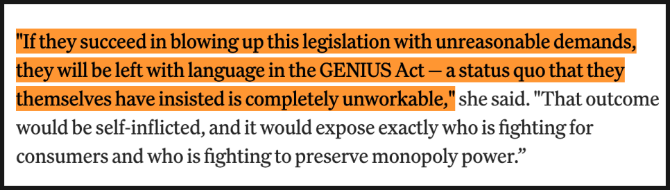 핵심 쟁점은 스테이블코인 보상, 다시 말해 스테이블코인을 보유하거나 사용하는 고객에게 제공되는 리워드 구조였습니다. 은행들은 암호화폐 기업들이 이런 보상을 통해 예금 기반을 잠식하고, 결국 미국 금융 시스템의 근간인 예금과 대출 구조를 위협한다고 주장했습니다. 반대로 암호화폐 업계는 은행들이 본질을 흐리고 있다고 반박합니다. 진짜 걱정하는 건 지역 은행이 아니라, 월가 대형 은행들의 결제 시장 지배력이라는 거죠.