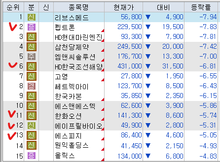 반면, 최근 강세였던 방산, 조선주가 차익매물로 하락