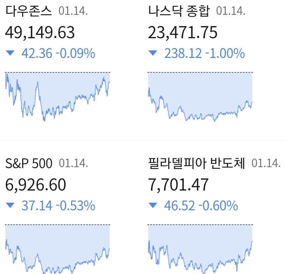 다우지수는 전일 대비 -0.09% 하락한 49,149.63에 거래를 마쳤으며, 대형주 중심의 S&P500 지수는 전장 대비 -0.53% 떨어진 6,926.60에 장을 마감하였습니다. 기술주 중심의 나스닥 지수는 전 거래일 대비 -1.00% 떨어진 23,471.75에 거래를 마치며 장을 마감하였습니다.