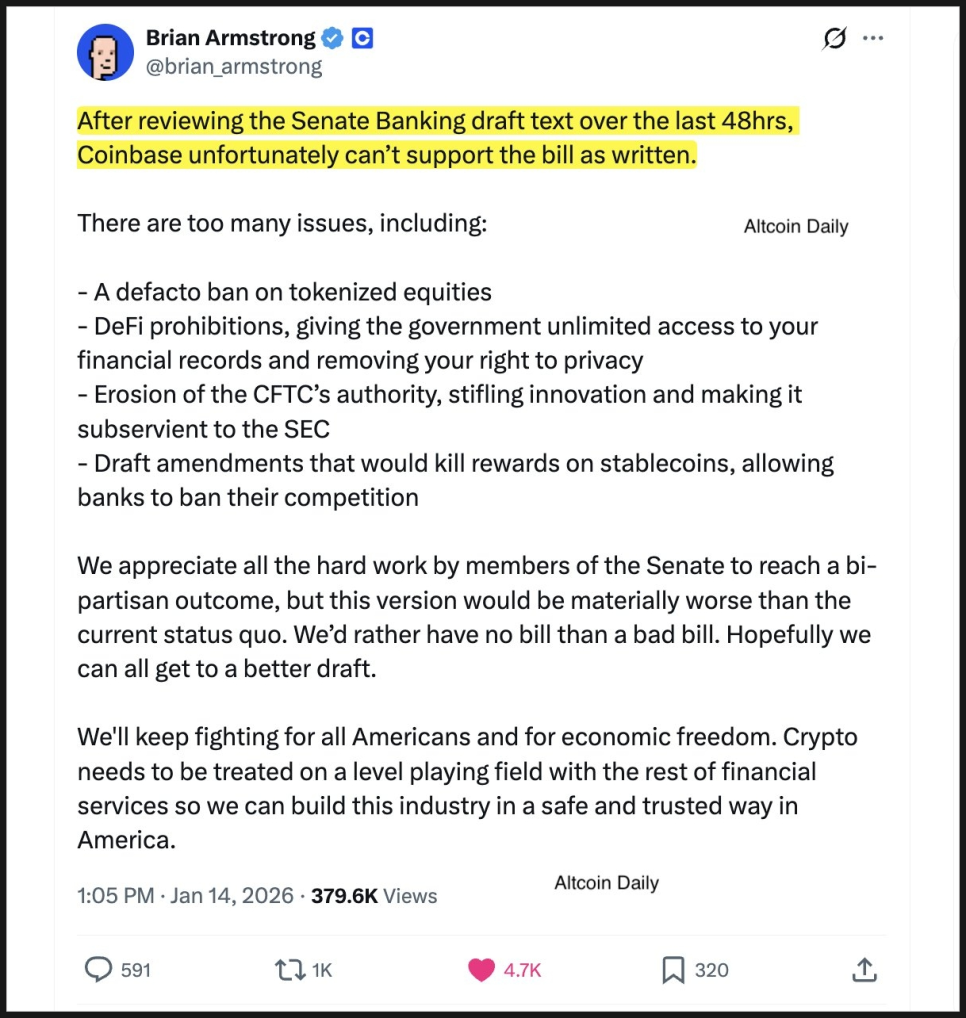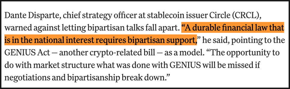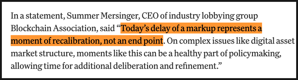 결정타는 코인베이스였습니다. 코인베이스 최고경영자인 브라이언 암스트롱은 스테이블코인 이자 구조, 토큰화된 주식, 탈중앙금융에 대한 법안 처리 방식에 문제가 있다며 공개적으로 지지를 철회했습니다. 다른 가상자산 기업들과 단체들은 여전히 법안 통과 의지를 밝히고 있지만, 업계 내에서도 이해관계가 갈리고 있다는 점이 분명해졌습니다.