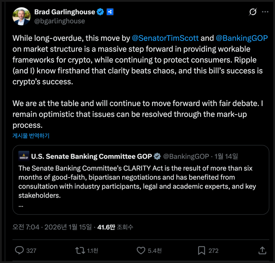 흥미로운 점은, 코인베이스가 빠진 이후에도 다른 가상자산 기업들과 단체들은 법안 지지를 이어갔다는 겁니다. 리플 최고경영자인 브래드 갈링하우스는 여전히 협상 테이블에 남아 있고, 표결 과정에서 문제를 해결할 수 있을 거라며 낙관적인 입장을 밝혔습니다.