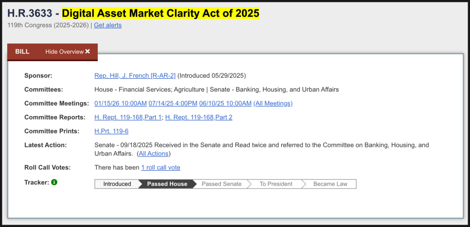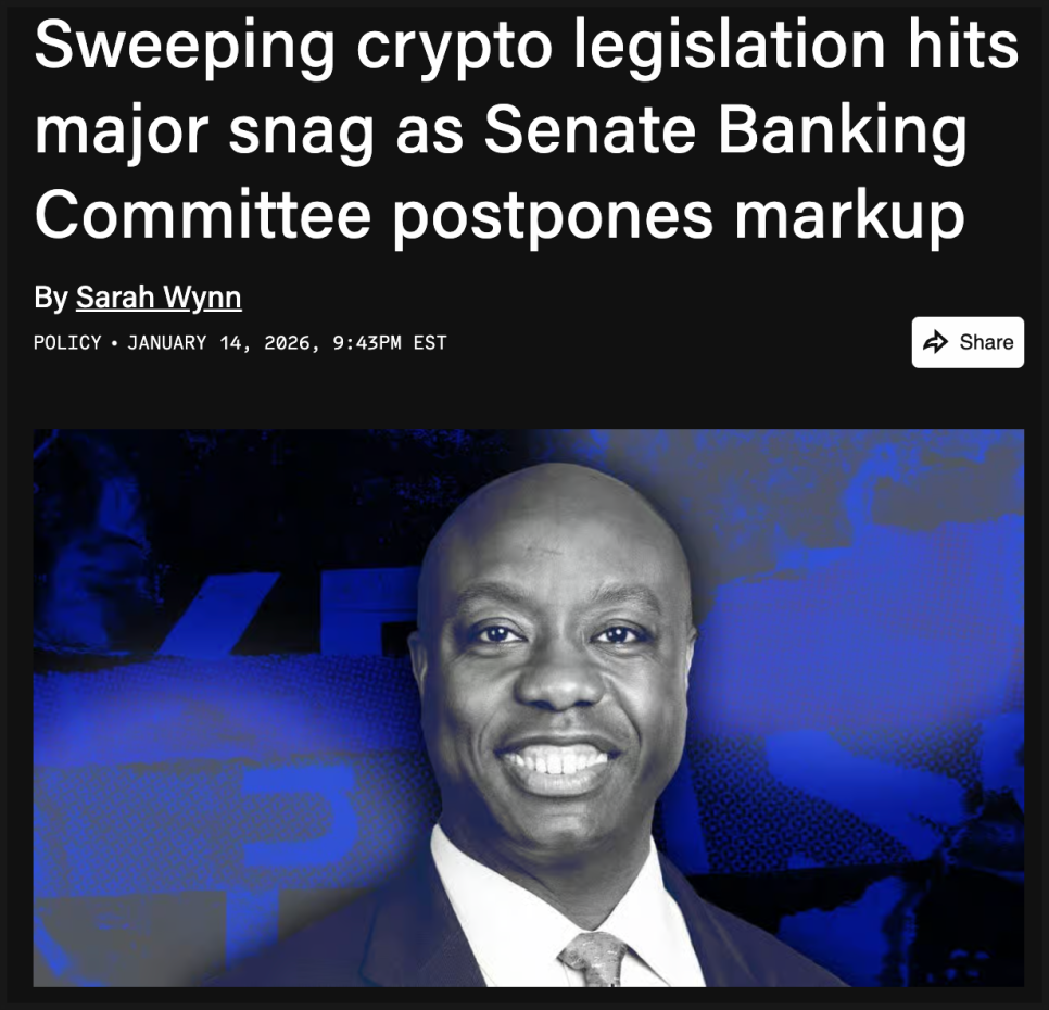 어제 컨텐츠에서 다뤘듯 원래 이 법안은 월요일 밤에 법안 원문이 공개됐고, 화요일 밤까지 수정안을 제출한 뒤 목요일에 위원회 표결까지 가는 빠른 일정이 잡혀 있었습니다. 그런데 표결을 불과 하루 앞두고 상원 은행위원회가 청문회 자체를 취소하면서 흐름이 끊겼습니다. 언제 다시 열릴지는 아직 정해지지 않았고요.