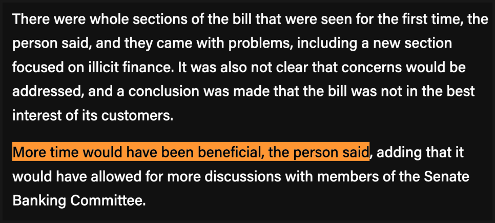 관계자에 따르면 시간이 더 있었다면 상황이 달라졌을 수도 있다고 하는데요. 상원 은행위원회 의원들과 더 충분히 논의할 기회가 있었다면 조정이 가능했을 수 있는데, 일정이 너무 촉박했다는 겁니다. 실제로 이 법안은 월요일 밤 공개되고, 화요일 오후까지 수정안을 제출한 뒤, 목요일에 바로 표결을 하려는 구조였습니다. 그 사이에 70개가 넘는 수정안이 쏟아졌는데, 법안이 아직 정리되지 않았다는 신호로도 볼 수 있습니다.