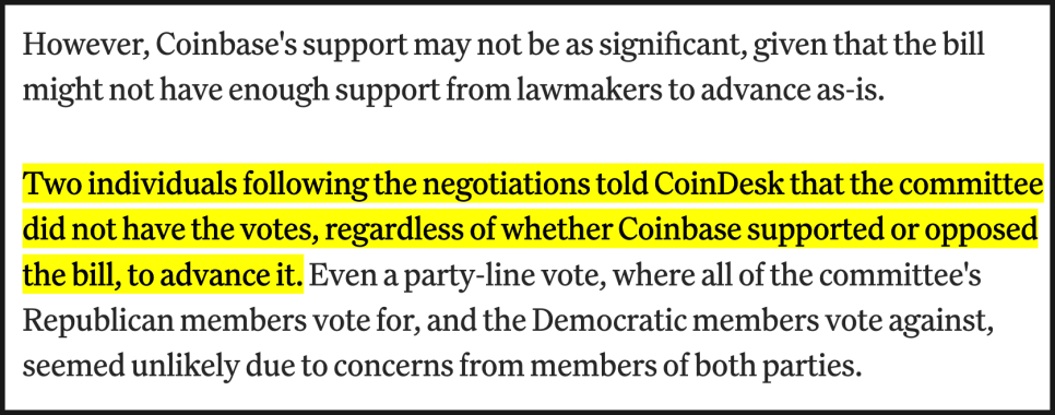 다만 코인베이스의 지지가 실제로 법안 통과에 결정적이었느냐에 대해 다른 시각도 있습니다. 협상 상황을 지켜본 복수의 관계자들에 따르면, 코인베이스가 찬성했든 반대했든 상원 은행위원회는 애초에 표결을 통과시킬 표를 확보하지 못한 상태였다는 겁니다. 공화당 전원 찬성, 민주당 전원 반대 같은 당론 표결조차 현실적으로 어려웠다는 얘기죠. 여야 모두에서 이견이 컸기 때문입니다.