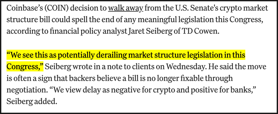 일각에선 코인베이스가 상원 가상자산 시장 구조 법안에서 손을 뗀 결정이 이번 회기 내 의미 있는 입법 자체를 무산시킬 수 있다는 분석이 있는데요. 미국 정책 분석으로 유명한 TD 코웬의 재럿 사이버그는 이 상황을 두고 “가상자산 업계에는 나쁘고, 은행에는 좋은 방향”이라고 평가했습니다.