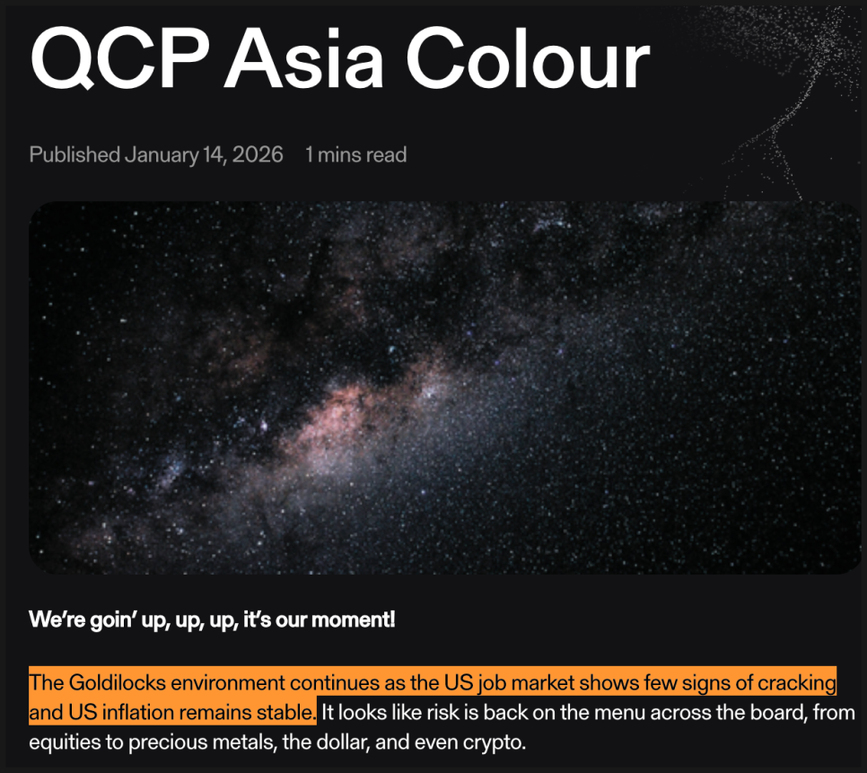 거시 환경도 나쁘지 않습니다. 큐씨피 캐피털(QCP Capital)은 지금 시장을 ‘골디락스’ 국면이라고 표현했는데요. 미국 고용 지표는 여전히 견조하고, 물가는 크게 흔들리지 않으면서 위험자산에 대한 선호가 주식, 금, 그리고 가상자산 전반으로 돌아오고 있다는 분석입니다.