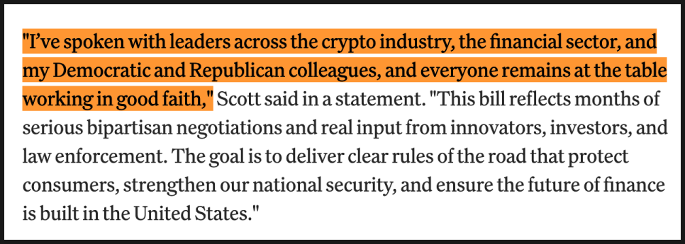 이런 상황 속에서 수요일 밤, 팀 스콧 상원 은행위원회 위원장이 결국 표결 절차를 연기한다고 발표한 거죠. 그는 업계와 금융권, 여야 의원들이 여전히 선의로 협상 중이며, 목표는 명확한 규칙을 만드는 것이라고 강조했습니다.