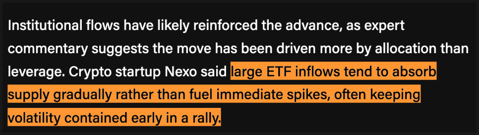 한편 크립토 금융 기업 넥소 측은 이번 상승이 단기 투기 자금보다 기관 자금 유입의 영향이 크다고 보고 있습니다. 특히 현물 비트코인 ETF로 들어오는 자금은 시장에 나오는 물량을 천천히 흡수하는 경향이 있다는 설명인데요. 그래서 초반에는 변동성이 상대적으로 억제되는 경우가 많다고 합니다.