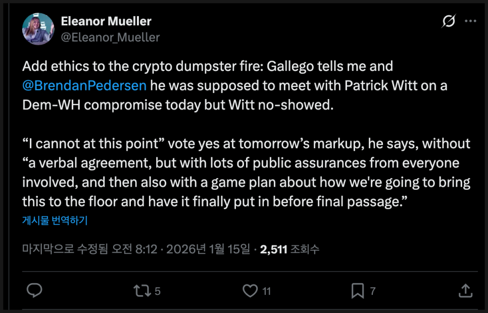 하지만 실제로는 수요일부터 균열이 빠르게 드러났습니다. 이 법안의 핵심 협상자 중 한 명인 민주당 루벤 가예고 상원의원은 백악관 디지털자산 자문기구 책임자와 만나기로 했지만, 상대가 나타나지 않았다고 공개적으로 말했습니다. 말 그대로 노쇼를 했다는 거죠. 그러면서 현 시점에서는 이 법안에 찬성할 수 없다는 입장을 밝혔습니다.