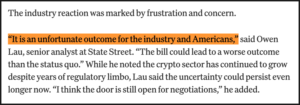 업계 반응도 엇갈립니다. 스테이트스트리트의 분석가 오언 라우는 이번 상황을 “업계와 미국 모두에게 아쉬운 결과”라고 표현했습니다. 그는 이 법안이 자칫하면 지금보다 더 나쁜 결과를 만들 수도 있었다고 지적하면서도, 규제 공백 상태가 더 길어질 가능성은 커졌다고 봤습니다. 다만 협상의 문이 완전히 닫힌 건 아니라고도 덧붙였습니다.