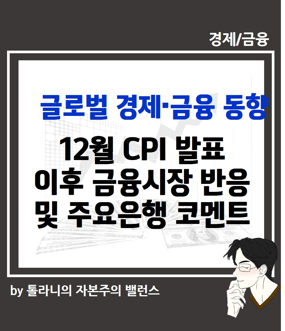 이에 ‘12월 소비자물가 CPI 발표 이후 금융 시장 반응 및 주요 투자 은행들의 의견’ 관련하여 한국은행 뉴욕사무소 보고서를 통해 좀 더 자세히 알아보도록 하겠습니다.