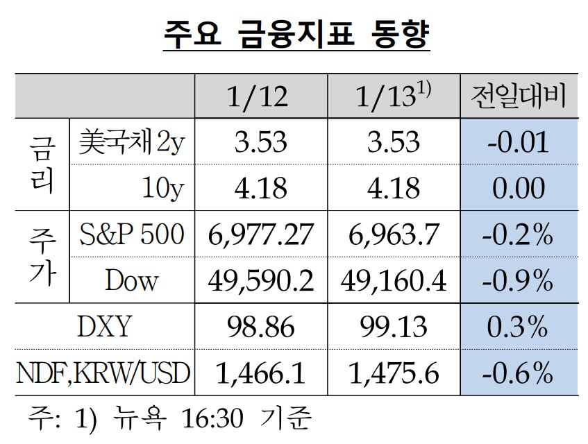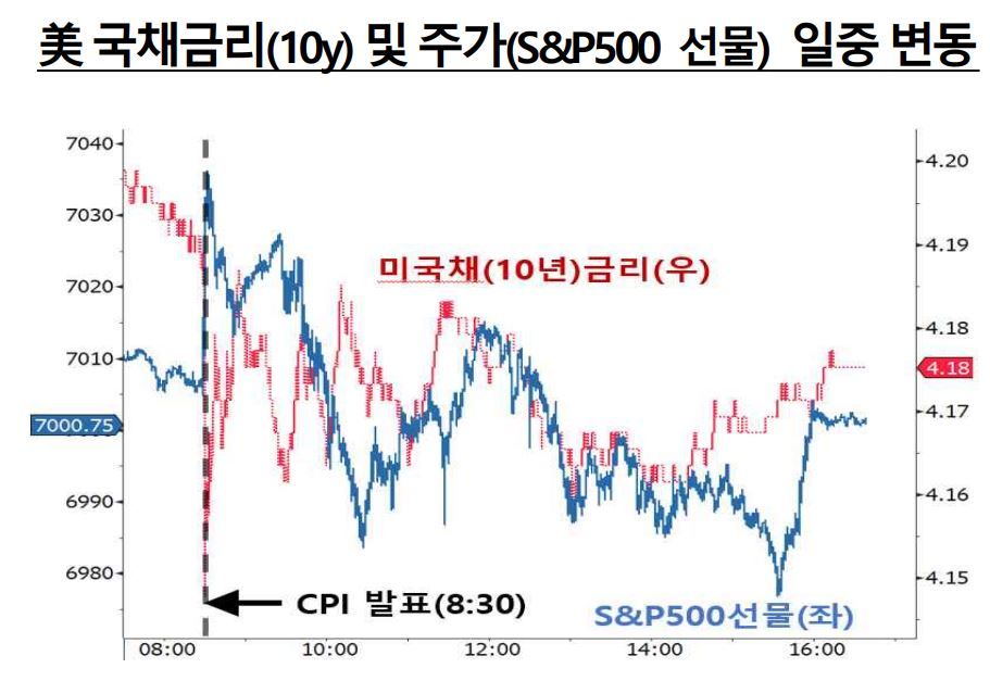 3) CPI 발표 직후 주요 금융시장 지표는 근원 CPI 상승률 예상치 하회에 반응하면서 금리가 하락하고 주가는 상승, 미달러화는 약세를 보였으나, 이후 CPI 세부 내용이 혼조세를 보였다는 인식 등으로 금리는 하락폭을 반납하고 미달러화는 강세 전환하였으며, 주가는 대형은행 실적 부진*, 트럼프대통령의 대이란 강경 발언** 등으로 하락 전환