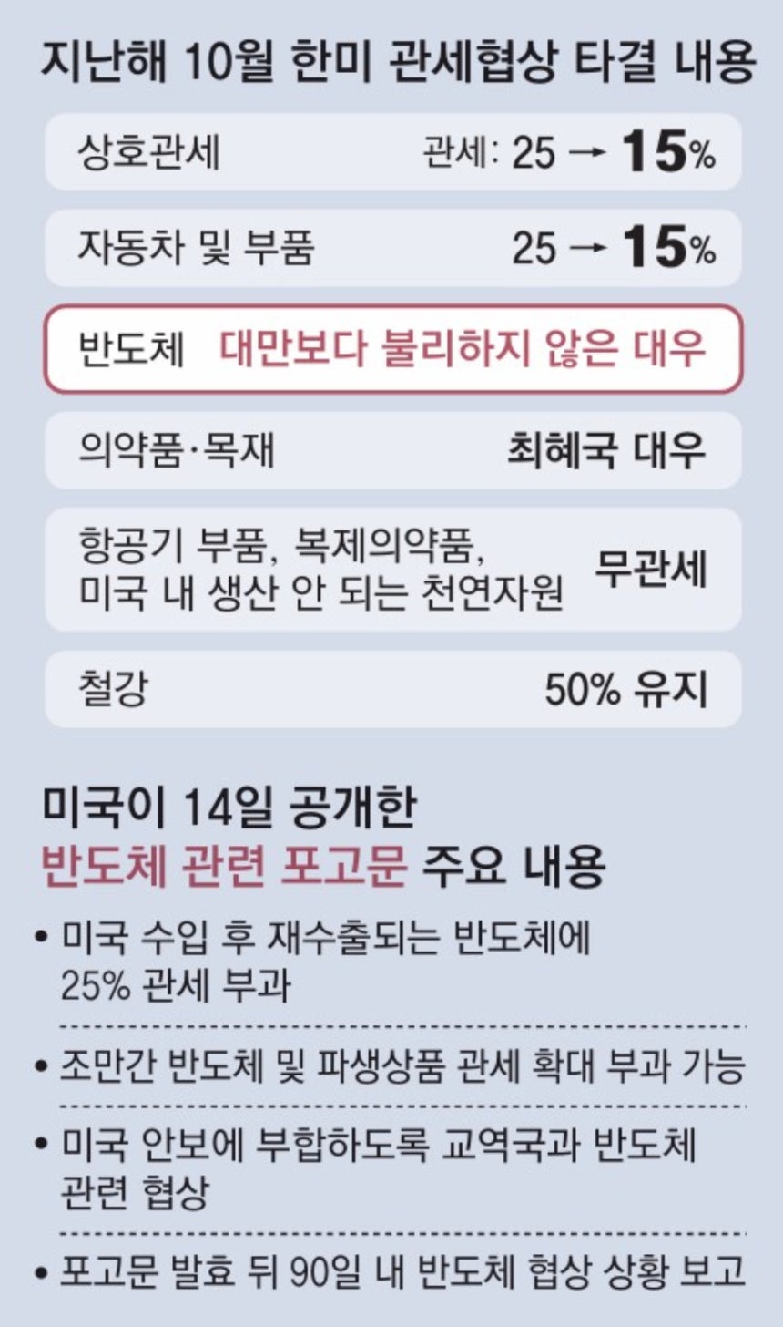 한국은 지난해 10월 한미 관세 협상 타결 당시 15%의 상호관세에 합의했지만 반도체와 관련해선 ‘대만보다 불리하지 않은 수준’만 명시했음