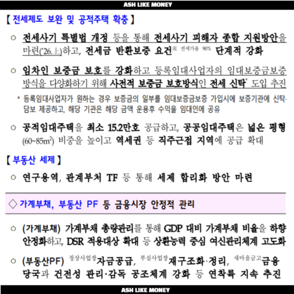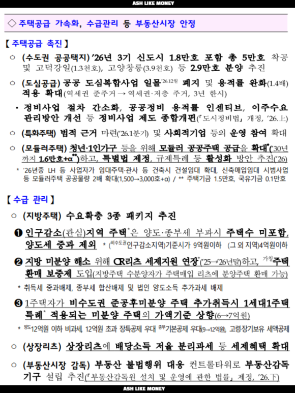 26년 경제성장전략에 따르면 서울, 수도권의 인구과잉을 해결하기 위해 좋은 입지의 재개발/재건축보다는 청년, 1인가구의 모듈러 공공주택, 서울 내는 공급하기 힘드니 수도권 외각에 3기 신도시 건설로 공급을 꾀하고 있다. 여기에 의미 있는 공급보단 준공 및 공급진행 중이라는 것을 보여주기 위해 소규모 재개발/재건축에는 인센티브를 주는 당근을 주었다.