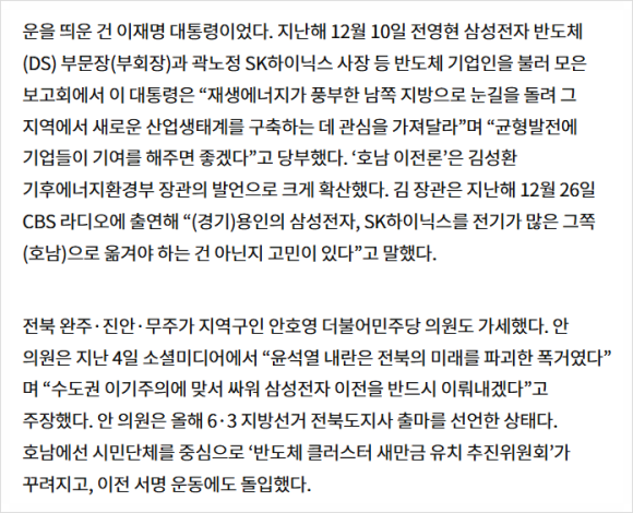 용인시는 삼성전자와 SK하이닉스의 공장 건설로 굉장히 핫한 곳이다. 반도체는 우리 나라의 존망을 지고 있을 정도로 매우 중요한 사업이고 여기에 나라든 기업이든 목숨을 걸고 있다. 하지만 최근 정치적 이유로 인해 용인시 반도체 클러스터를 전북 새만금으로 이전하자는 주장이 나와 논란이 되었다. 대통령은 반도체 기업인들을 불러 "재생에너지가 풍부한 남쪽(전라도)지방으로 눈을 돌려 그 지역의 생태계를 구축해달라고" 부탁을 한 것이다.