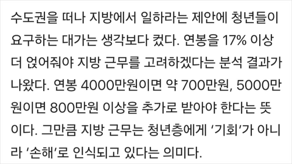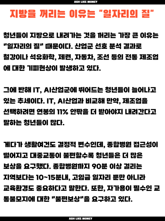 IT나 반도체 같은 인적자원이 중요해지는 지금 사회에서 핵심인재들이 서울, 수도권에 몰리지 지방에 오지는 않는다. 만약, 정부가 지방 부지에 세금감면 등을 비롯한 엄청난 인센티브를 주고 지방으로 옮기는 인재들에게 연봉을 더 올려준다면 그나마 가능성이 있어진다.