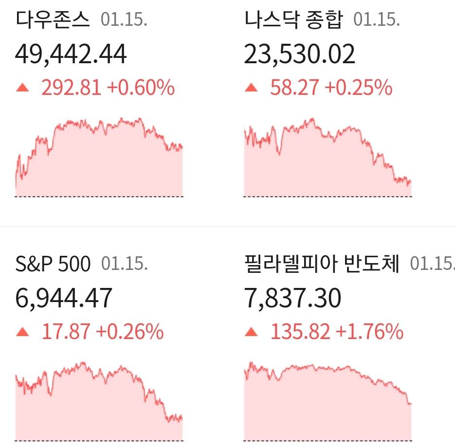 현지시간 15일 미국 뉴욕증시 3대 지수 모두 상승하면서 거래를 마쳤습니다. 미국 트럼프 대통령의 이란과 그린란드 발언으로 인한 지정학적 리스크, 파월 연준 의장의 수사 등의 연준의 독립성 우려로 잠시 주춤했던 증시는 TSMC의 분기 사상 최대 실적 발표와 미국내 대규모 투자 빅딜이 성사되면서 투자 심리에 긍정적인 영향을 미친 것으로 분석하고 있습니다.