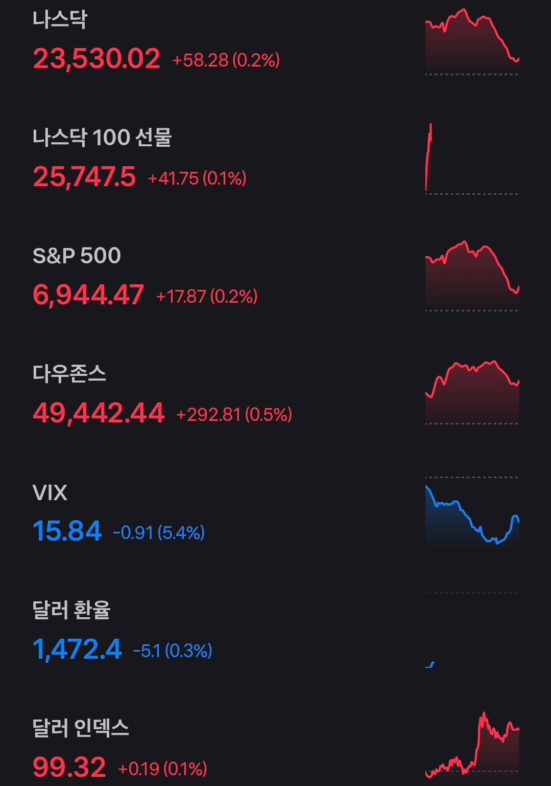 지수는 큰 방향성보다는 온도 차가 느껴진 하루였습니다. 나스닥과 S&P500은 소폭 상승에 그쳤지만 다우가 상대적으로 강했고 변동성 지표는 15대 중반으로 내려오며 단기 경계감이 완화된 모습입니다. 원달러 환율은 1,472원대까지 내려오며 숨을 고르는 흐름이었고 달러 인덱스는 99선 부근에서 제한적인 반등을 보였습니다. 심리는 중립을 넘어서는 구간으로 이동했지만 정책 리스크와 실물 둔화 신호가 동시에 존재해 한쪽으로 쏠리기에는 아직 변수가 많은 환경으로 정리됩니다.