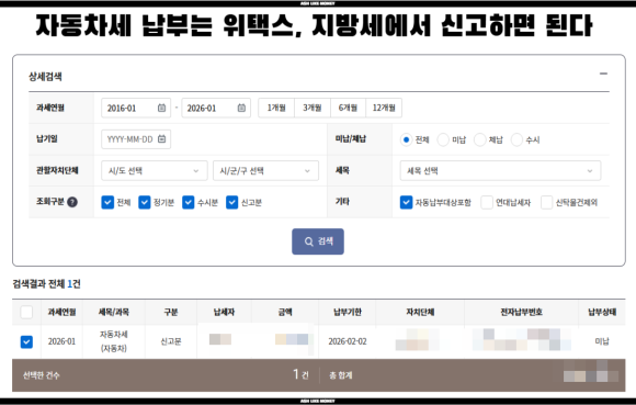 자동차세의 조회는 고지서 없이 위택스에서 가능하다. 지자체에 따라 지방세 납부 시스템을 별도로 운영하는 경우도 있지만 기본적으로 위택스에서 신청하는 것이 편하다. 자동차세를 연납하면 최대 5%의 공제를 해주는데 전체 세액에 5%를 적용하는 것이 아니라 이미 경과한 기간을 제외한 잔여 기간에 대해서만 공제가 적용되는 것이다.