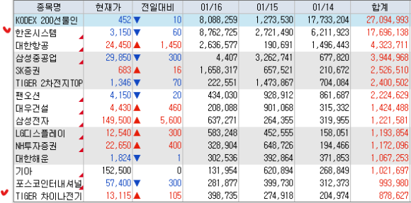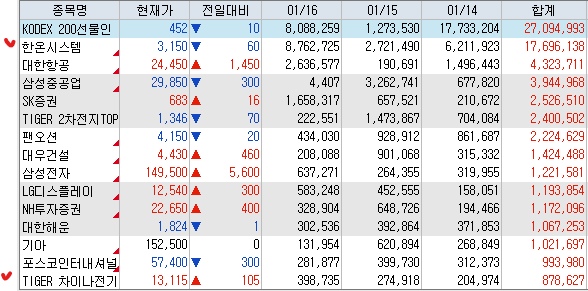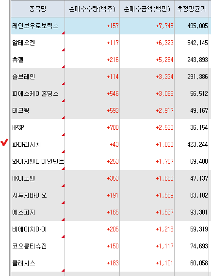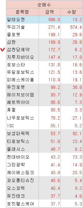 매도 : 기아 한화(+51.03%) 대한항공 Posco홀딩스 삼성전자(+102.30%) 서부T&D 포스코엠텍(+39.41%) HD한국조선해양 한화솔루션 퍼스텍 한국전력 삼성증권 SK텔레콤 포스코DX(+66.57%) 팬오션 KT SK 한화오션 포스코인터내셔널 한국항공우주(+62.46%) 인탑스 한전KPS LG화학 에스피지 현대로템 케이에스 LIG넥스원(+38.13%) 로보스타 휴림로봇(+156.66%) 매커스 HJ중공업 CJ제일제당 스맥 풍산 로보티즈 KODEX레버리지 피엔티 휴젤 코스맥스 알테오젠 클래시스 케어젠 심텍 한화시스템(+85.38%) 에이피알 케이씨텍 에이비엘 뉴로메카(+118.43%) LG에너지솔루션 F&F HPSP Tiger2차전지TOP10레버리지 KODEX로봇액티브 두산로보틱스 엔젤로보틱스 지투지바이오 나우로보틱스(+48.17%) SOL조선TOP3플러스 온코닉테라퓨틱스 티엑스알로보틱스 코오롱티슈진