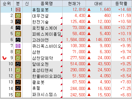 이외에 퓨리오사AI 테마, 미용기기 테마, 탈모치료 테마, 로봇 테마, 일부 자동차부품 테마 상승