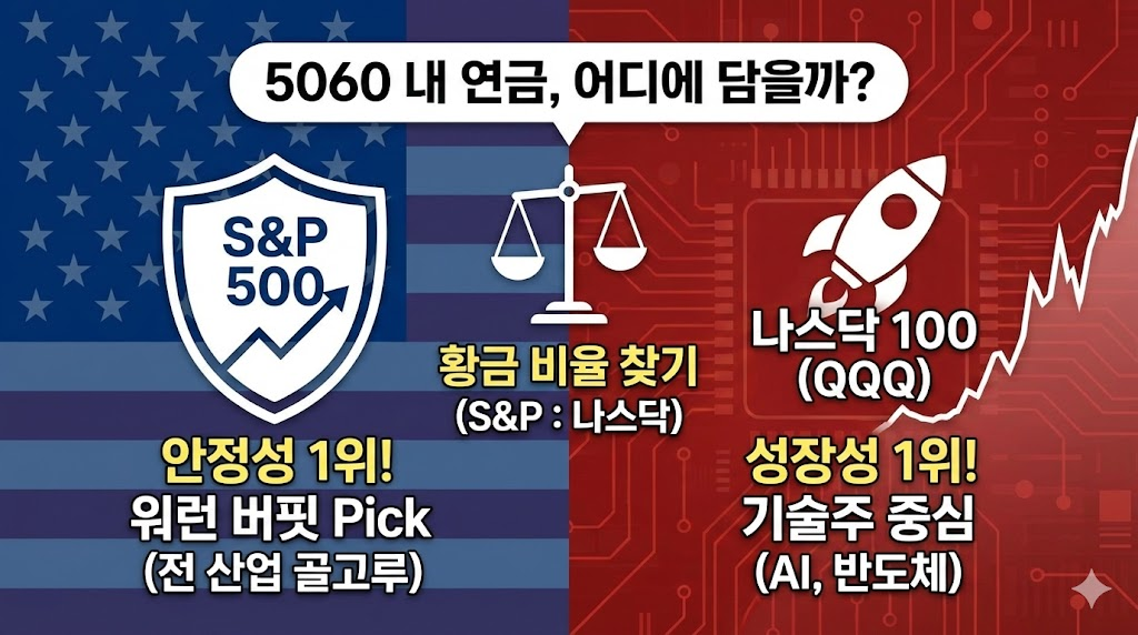 본인의 투자 성향과 은퇴 시점에 맞춰 두 ETF의 비율을 조절하는 것이 핵심입니다. 예를 들어, 안정형이라면 [S&P 500 70% : 나스닥 30%], 성장형이라면 [S&P 500 50% : 나스닥 50%] 처럼 자신만의 '황금 비율'을 만들어 보십시오. 미국 시장 전체에 투자하는 것은 그 어떤 개별 종목보다 강력한 노후 대비 수단입니다.