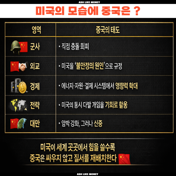 그래서 미국 입장에선 절대 중국이 대만에 침공하여 TSMC를 확보하지 않도록 가만히 두지 않을 것이다. 현재 트럼프의 횡보를 보면, 나라의 "국력"이 얼마나 중요한지 가르쳐주고 있고 자신의 앞길을 막는 국가들을 적으로 간주하여 "힘"으로 본때를 보여주고 있다. 마두로를 쿠팡배송시키고 이란의 반정부 시위에 군사개입을 준비하며, 멕시코 마약 카르텔을 군대로 척결하며, 덴마크의 그린랜드를 차지하려고까지 한다.