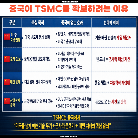 중국은 자국 내에서 아직 TSMC 만큼의 공정 실현이 불가능하여 미중 갈등이 심화되면 심화될수록 반도체 기술이 밀려 결국 우위를 점하는 것이 어려워진다. 그래서 TSMC를 확보하여 수십년의 기술격차를 확보하기 위해 대만을 중국의 나라라고 칭하며 계속 도발하는 것이다. 만약, 중국이 TSMC를 통제한다면 미국의 반도체 제재 효과가 커지고 AI, 군사, 슈퍼컴퓨터 분야에서 미국을 넘어설 수도 있다.
