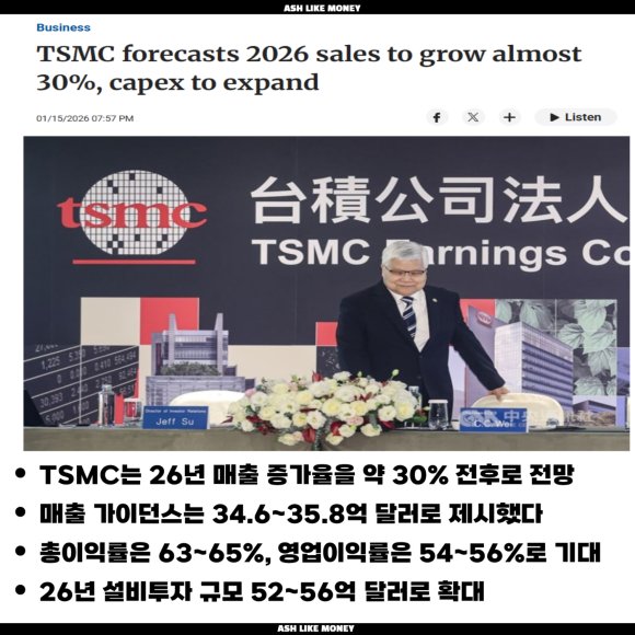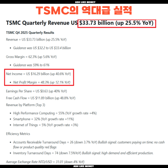 TSMC는 최근 역대급 실적을 발표했다. 25년 4분기에 매출이 무려 1조 460억 9천만 대만달러이며 전년 동기 대비 20%나 올랐다. 순이익은 5,057억 300만 대만달러로 전년 동기 대비 32%나 오른 역대급 실적을 보여주었다. 영업이익은 5,649억 300만 달러, 영업이익률은 54%이다. 이는 AI 수요가 여전히 강세라는 것을 보여주고 AI 산업이 버블이 아니라는 것을 일단락하는 지표이다.